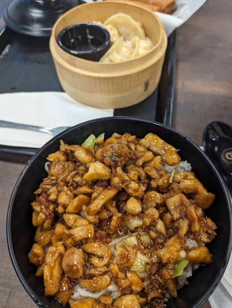 Chicken thigh stir fried in teriyaki sauce served over rice and cabbage/bean sprout mix